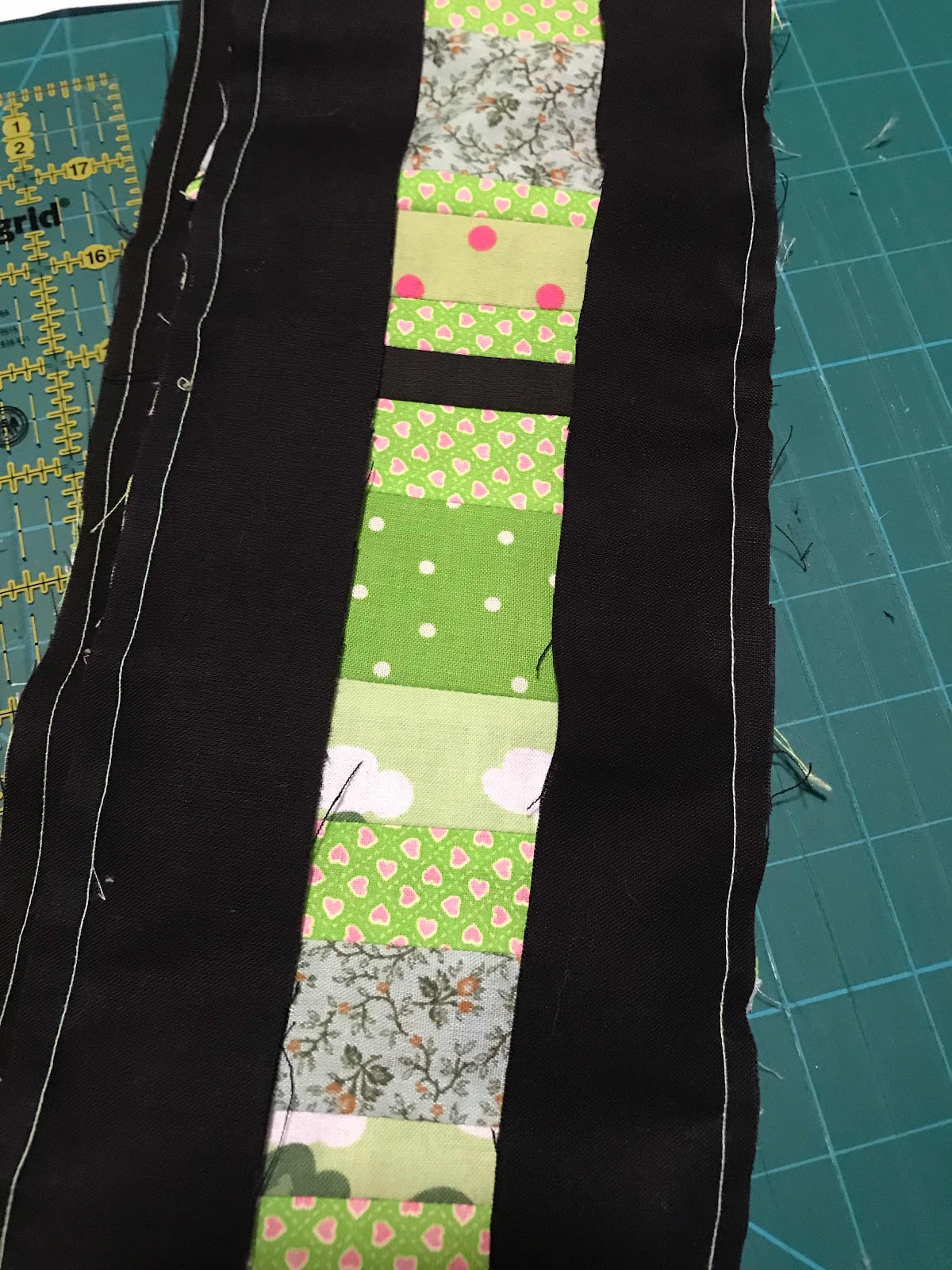 Sew side strips together.rectangular strips, the same length as the black ladder strips. Use a variety of fabric in one color.