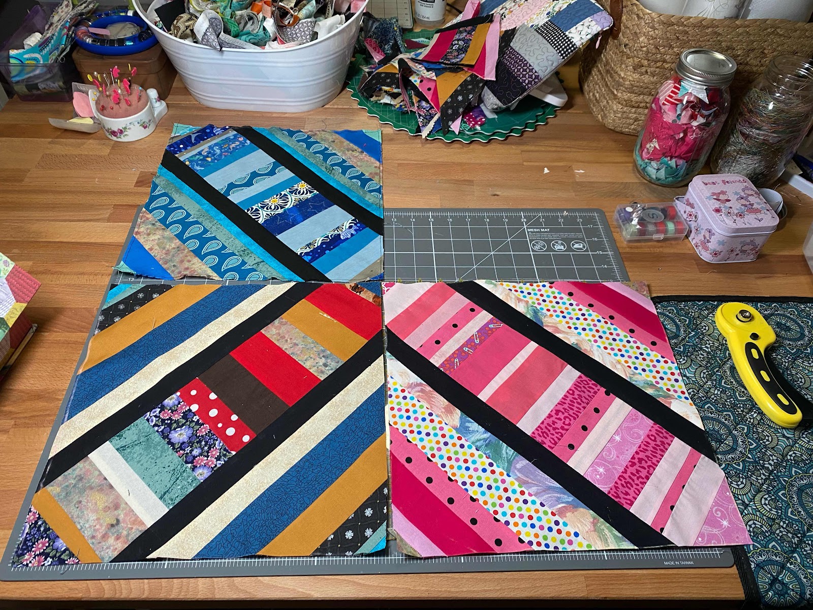 First, I went through my fabric scraps. Then sewed together pieces between 1” to 2.5” wide by 5-6“ long.