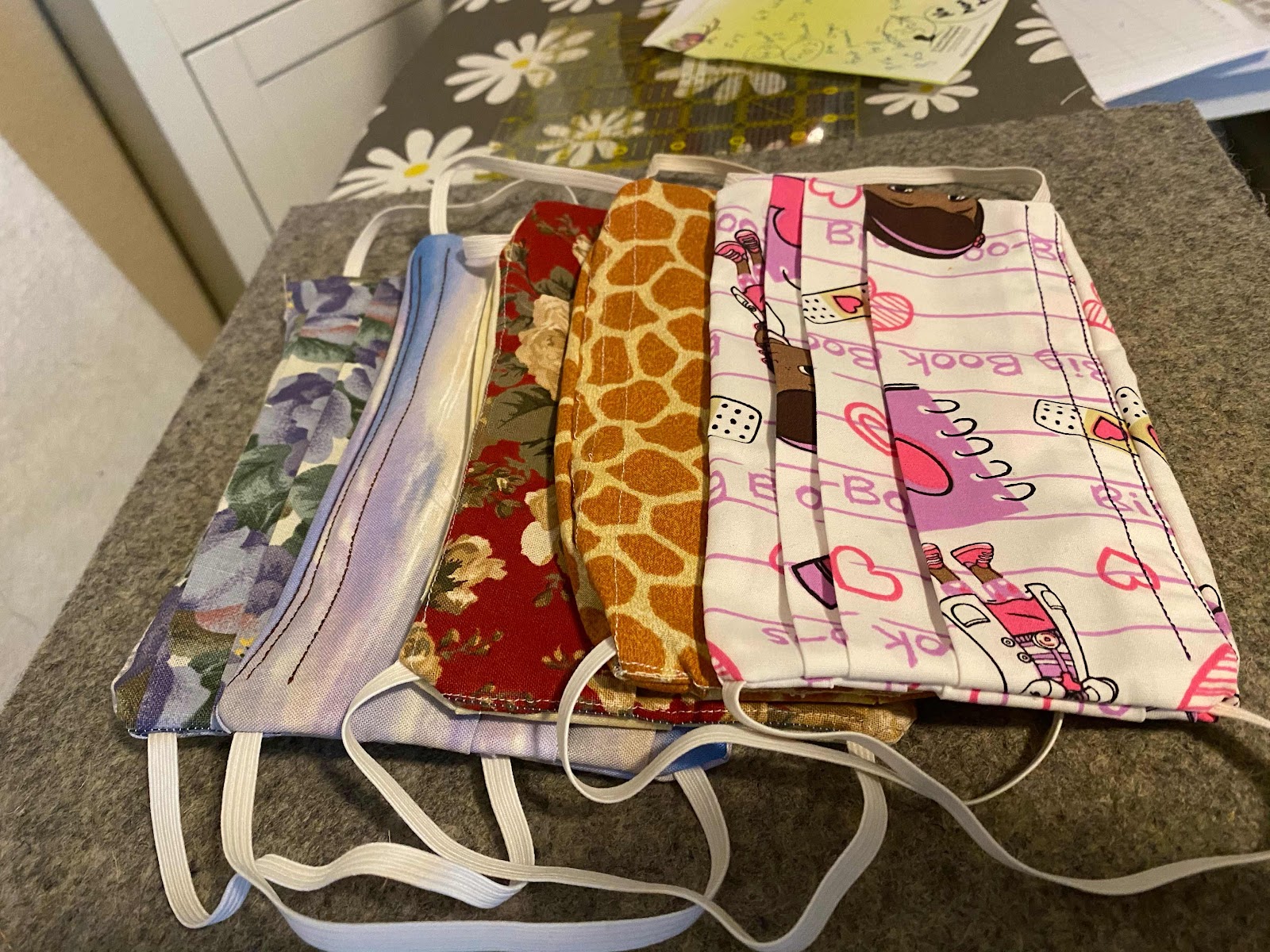 My husband wasn’t a fan of the rectangular mask design and requested I make one like my aunt Kerry had made for her bus and (my uncle). I asked her where I could find the pattern she used and she messaged me “Craftpassion.com”. I was a little intimidated with this pattern, but I made 5 last night and they turned out pretty good.