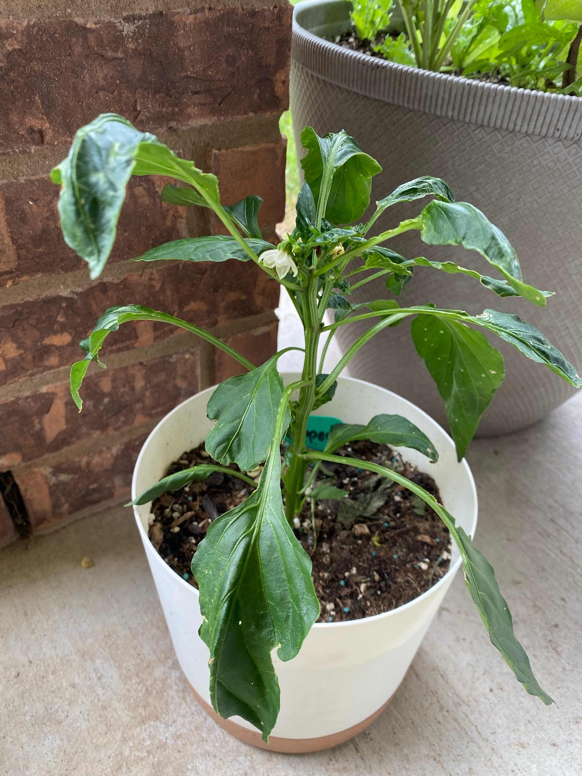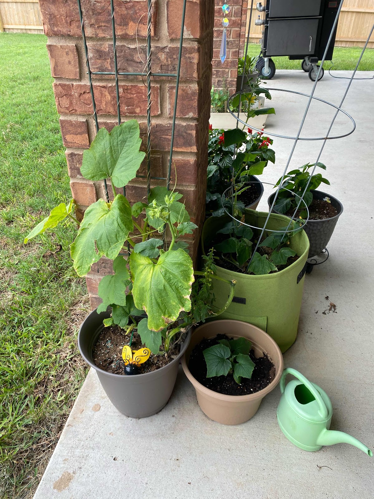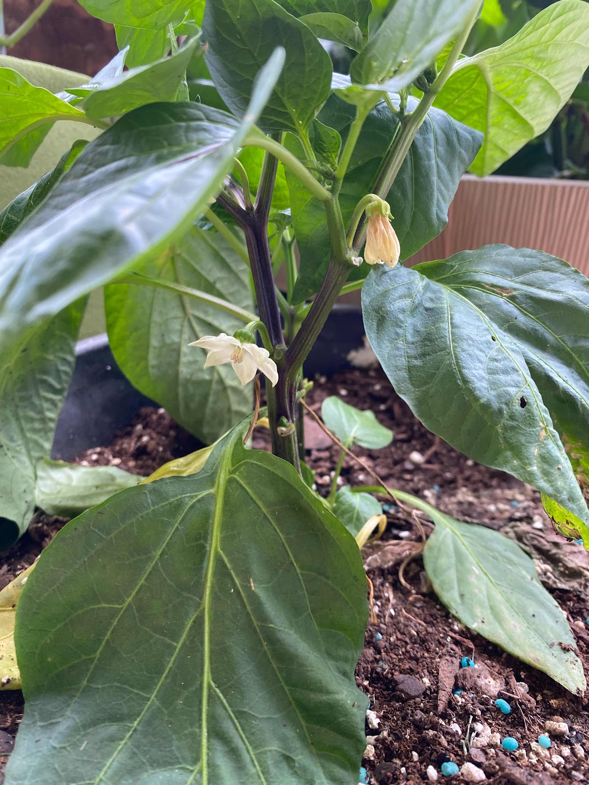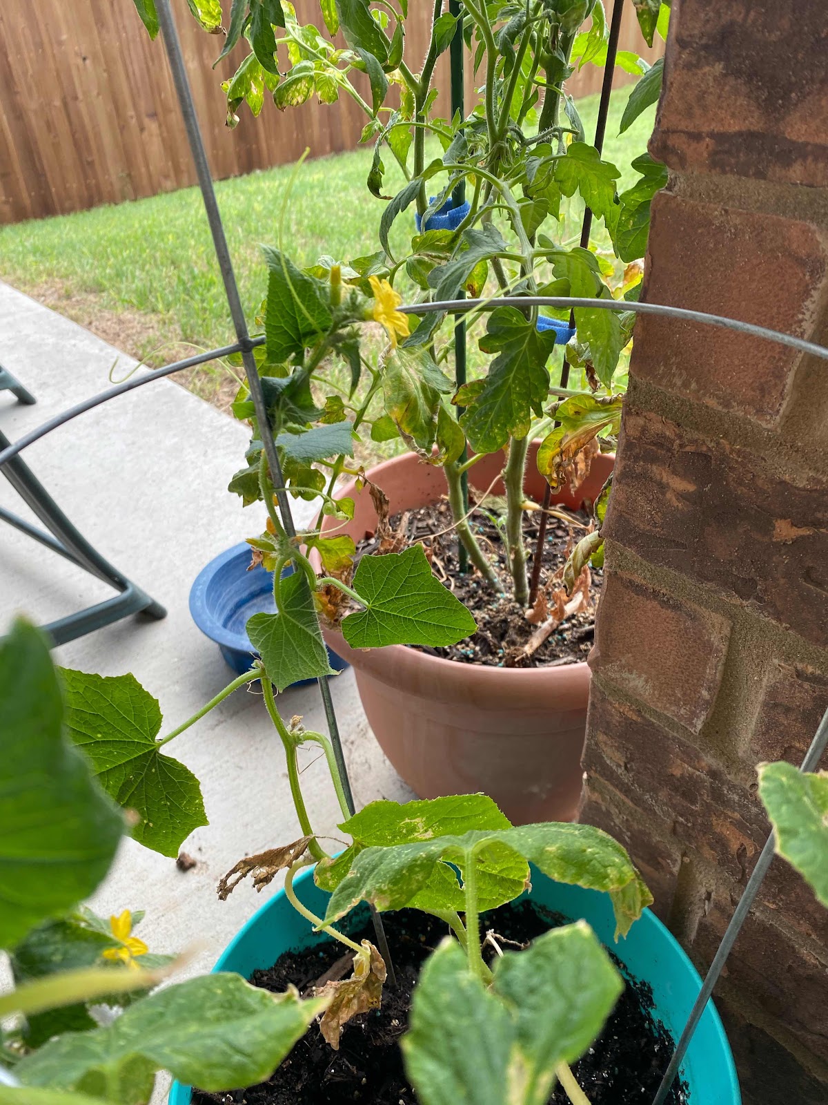 Plants grown in containers need frequent watering as the containers dry fast. Watering on a daily basis is necessary to provide adequate moisture for plant growth. Apply enough water to reach the bottom of the container. Allow the excess to drain out through drainage holes. Avoid wetting the leaves when watering as this will encourage development of foliar disease. Try not to allow the containers to dry out completely between watering as this will lead to flower and fruit drop. Do not over water the plants as the container will be waterlogged and the roots will lack oxygen leading to poor growth and eventually, perhaps, the plant's death.