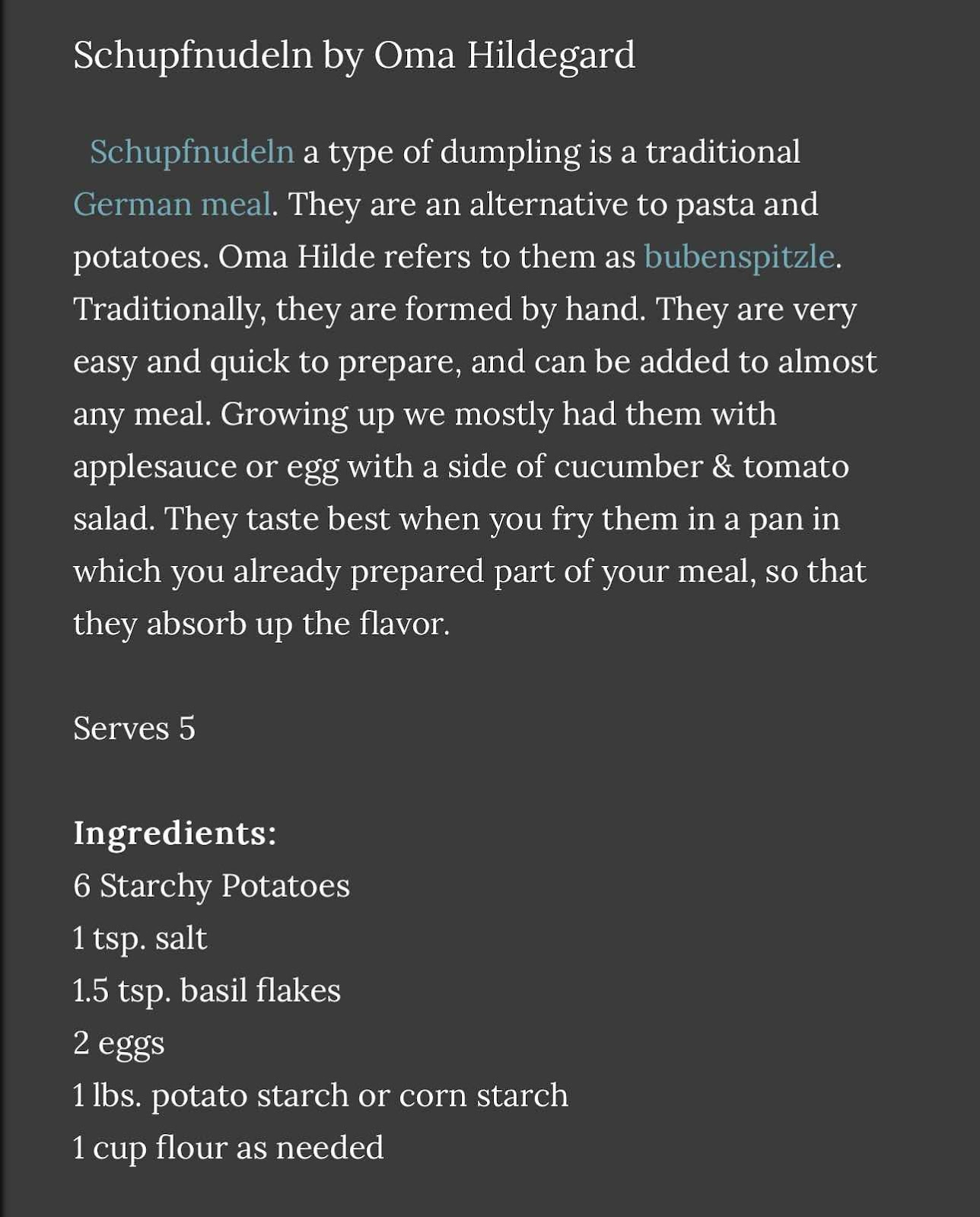 What to do with leftover mashed potatoes on December 03, 2024 Get link Facebook X Pinterest Email Other Apps After Thanksgiving this year- we had lots of leftovers. Mashed potatoes to Gnocchi „here“. The gnocchi reminded me of Oma Hilde‘s Schupfnudeln. Mashed potatoes to potato pancakes „here“. Comments